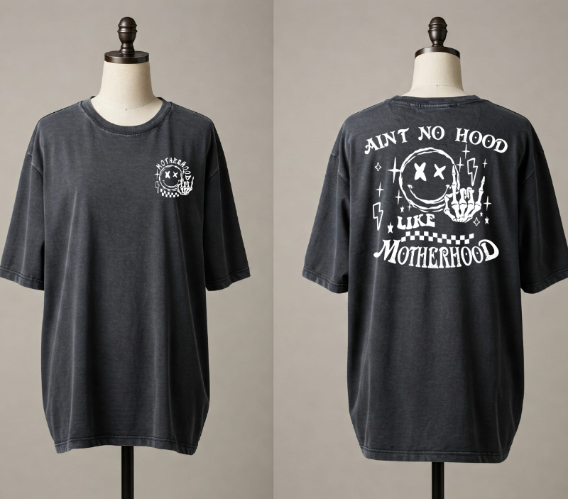 It features a subtle "motherhood" print on the front left chest, while the back boldly declares "Ain't no hood like motherhood" – a tribute to the strength, love, and undeniable spirit of moms everywhere.