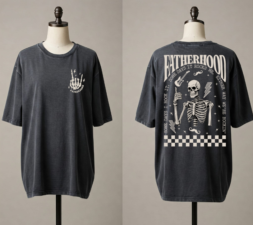 It features a subtle "Fatherhood" print on the front left chest, while the back boldly displays a large print on the back – a tribute to the strength, love, and undeniable spirit of dads everywhere.