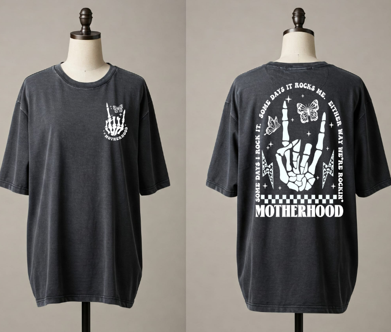 It features a subtle "motherhood" print on the front left chest, while the back boldly display's a large print – a tribute to the strength, love, and undeniable spirit of moms everywhere.
